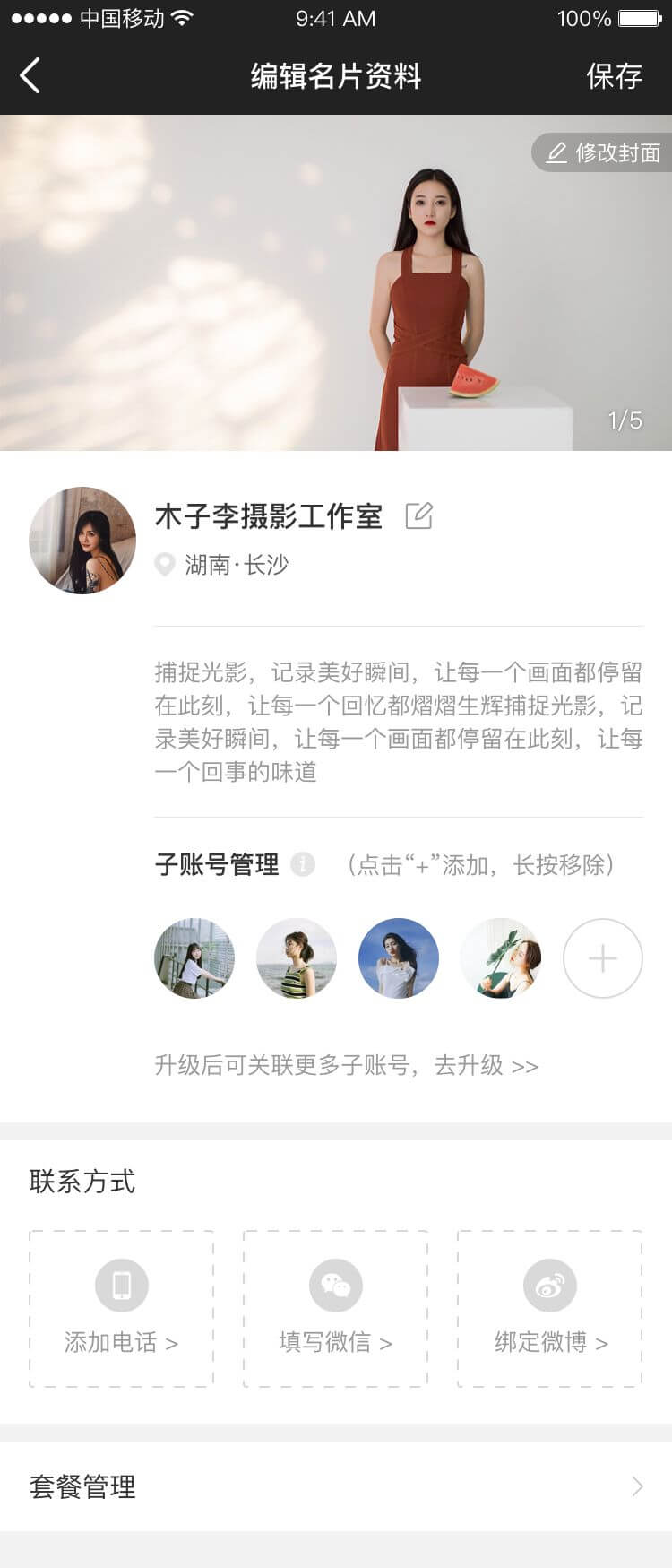 智能名片是一个为摄影师量身定制的品牌宣传和CRM系统,小小的电子卡片集合了您的 作品集、 套餐详情、 个人信息、 用户好评 等重要信息。一键发送,一键保存,即方便您传递价值,也方便用户找到您。