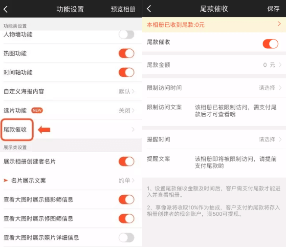 摄影师可以在相册中设置未收款金额及催收日期,到期后在相册访问时会出现催收提示(文字可以自定义),如果甲方仍然拒不付款,相册链接将无法打开继续访问。(PS:平台将收取10%手续费)