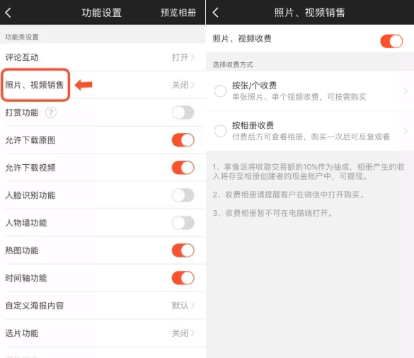 还可以设置整个相册统一收费,用户在进入相册时可以按照提示自行选择付费方式。(PS:平台将收取10%手续费)