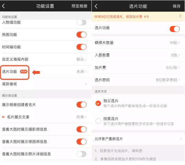 Step1:摄影机构打开选片功能,选择独立选片,设置免费照片的数量,自定义加片付费价格;